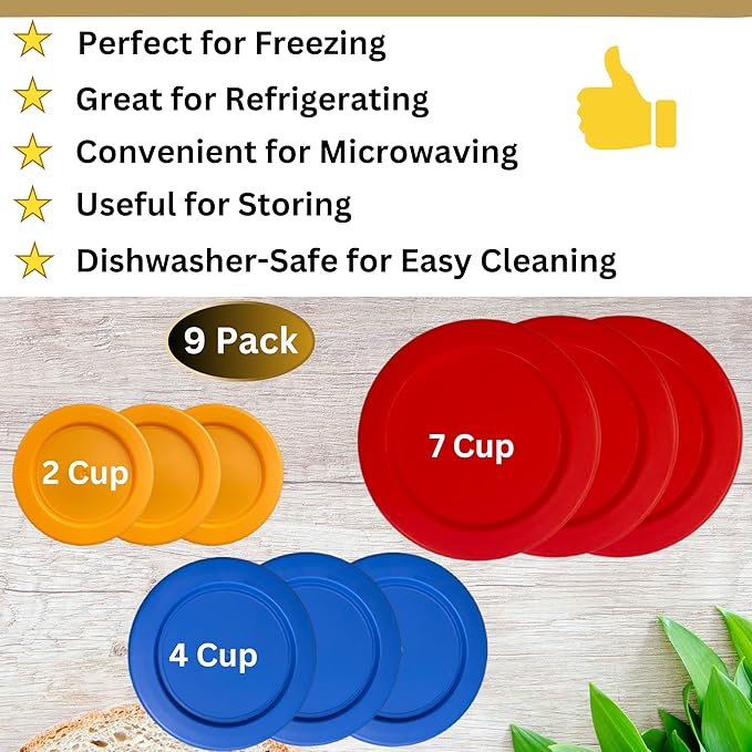2, 4 & 7 Cup Orange, Blue, Red Replacement Lids/Covers for Pyrex, Anchor Hocking & KlareWare Storage Bowls *Lids Only Glass Container Not Included* (9 Pack *Three of Each Size*)