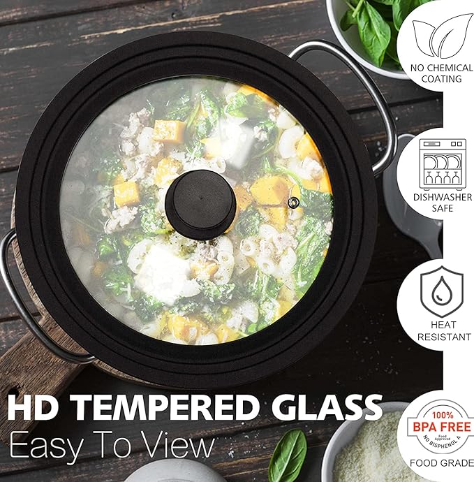 • PREMIUM SILICONE AND STRONG TEMPERED GLASS : The edge of the lid consist of food-grade silicone which is heat resistant to resist even under the high temperature cooking. The pot lid is made of tempered glass and silicone surrounded, strong, durable, reliable and not easy broken.