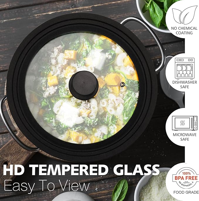 • PREMIUM SILICONE AND STRONG TEMPERED GLASS : The edge of the lid consist of food-grade silicone which is heat resistant to resist even under the high temperature cooking. The pot lid is made of tempered glass and silicone surrounded, strong, durable, reliable and not easy broken.