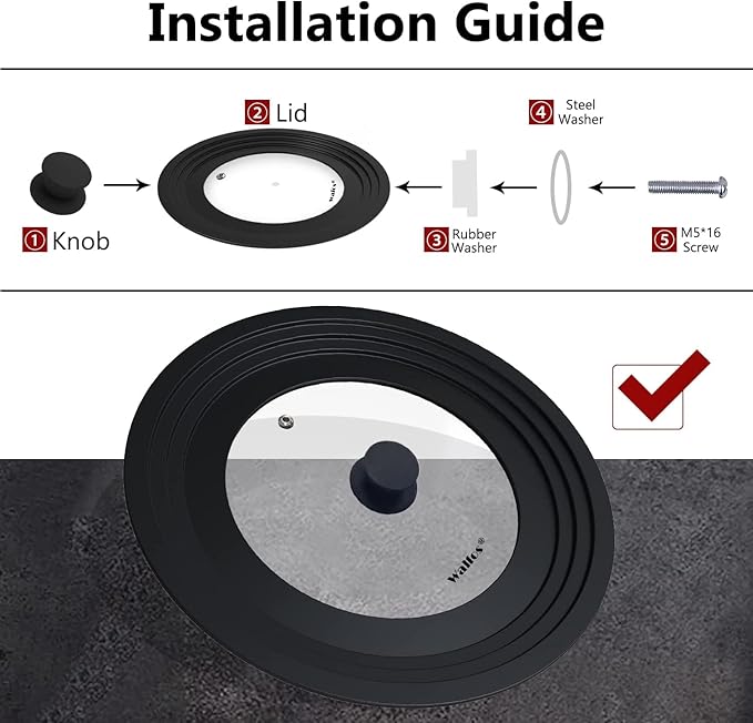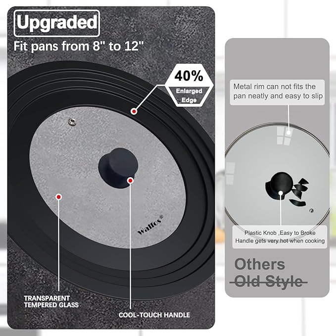 • Multi-Purpose: Walfos cookware and bakeware universal lids fits most pots, pans and skillets in your kitchen with diameters from 8 inch to 12 inch. Note: The lid not suitable for pots with two raised handles.