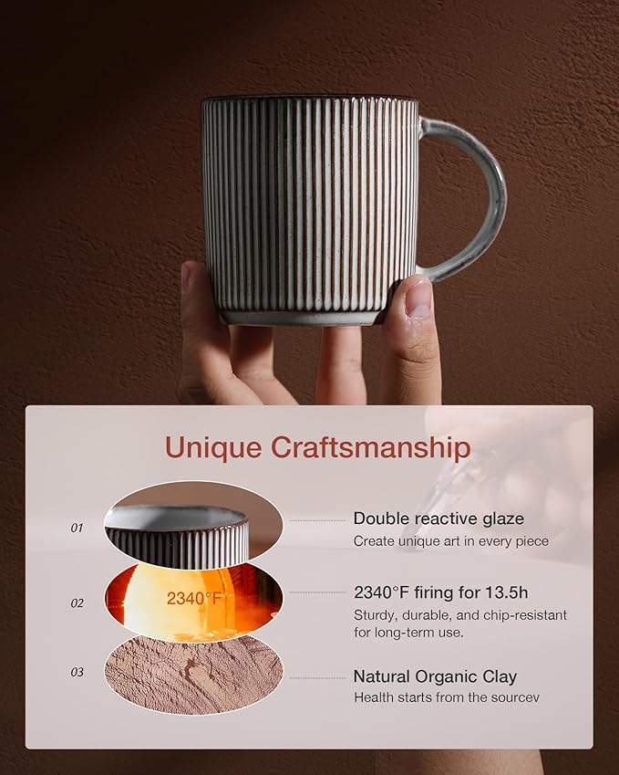 • WITHSTAND THE TEST OF TIME: These coffee mugs are made of organic and natural clay, fired at 2340 ℉ for 13.5 hours to make them sturdy, long-lasting, and chip-resistant for long-term use