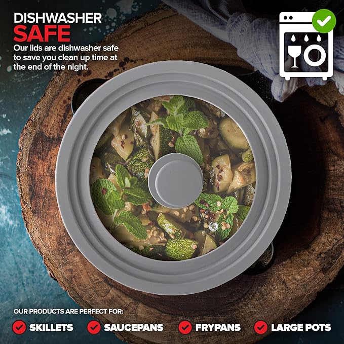• Easy Organization: Clear clutter from your cupboard and cabinets. The universal design of our lids allow them to fit a variety of 7 to 12 inch diameter cook-wares and like a crock, skillet, wok, fry-pan, and more! They're also dishwasher safe.