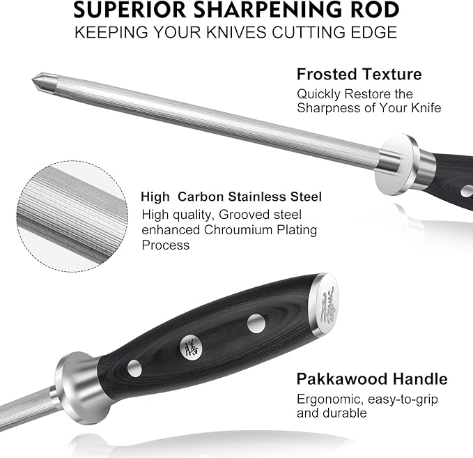 • 【Fiberglass G10 Handle, Comfortable Grip 】 Adopts frosted glass fiber G10 handle which is much more comfortable and solider than the wood handle, it becomes an ergonomically designed top-balanced professional knife to provide high-performance cutting for meat, vegetable, and fish.