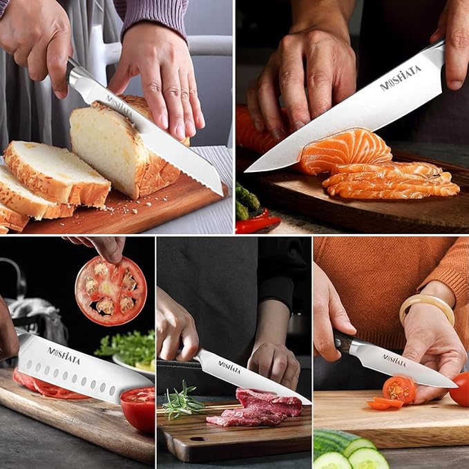 • 【All in One Kitchen Knife Set】-5 pieces kitchen knife set includes: Chef Knife, Bread Knife, Utility Knife, Paring Knife, Santoku Knife.