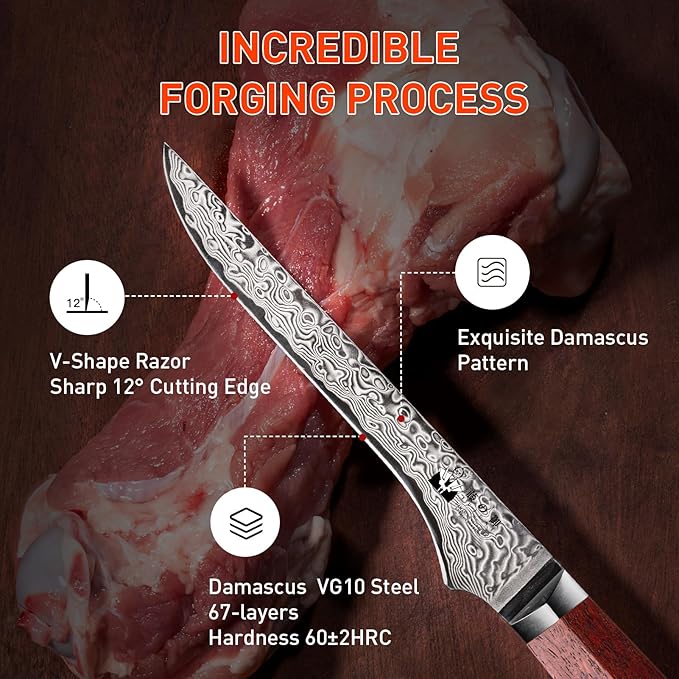 • Razor Sharp Blade: Each knife is impressively sharp, with a 12-degree cutting edge. Thanks to a double bevel edge sharpened 50/50, this knife is suitable for both right and left hander. Feel like a master chef in the kitchen with our Damascus boning knife