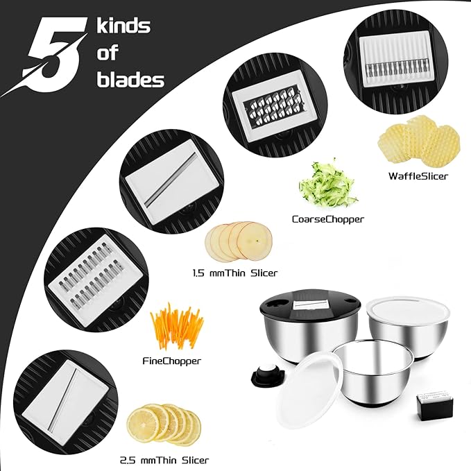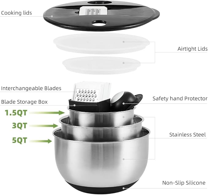 • 🔥[Various Sizes for Everyday Use]-Including 3 stainless steel mixing bowls with the size of 1.5qt, 3qt and 5qt, one used for cooking lid and another 2 for storage.This essentials set can cover the basic needs of your kitchen.