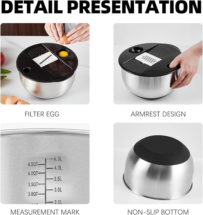 • 🔥[High Quality Stainless Steel Mixing Bowls]-Made of premium gauge stainless steel,durable,which is dent resistant and rustproof, the non-slip silicone bottom prevents the stainless steel bowl from sliding during use.