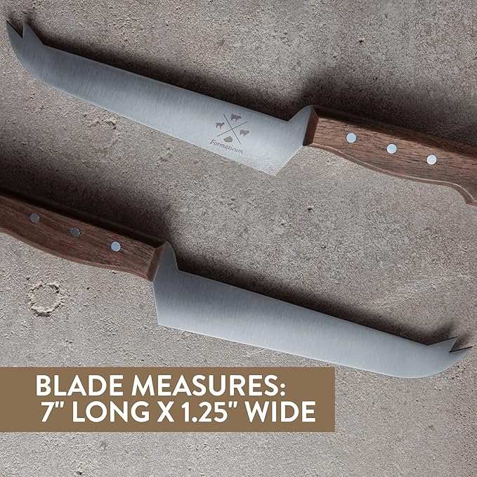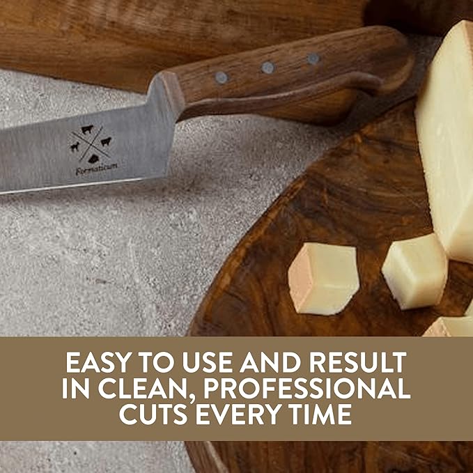 • STAINLESS STEEL BLADE: Formaticum's professional cheese knife features a durable and rust-resistant 7" x 1.25" stainless steel blade, making it easy to share bits with friends. This expertly designed cheese slicer effortlessly cuts all types of cheese and features a tasting fork at the tip, making it an essential tool for your charcuterie board.