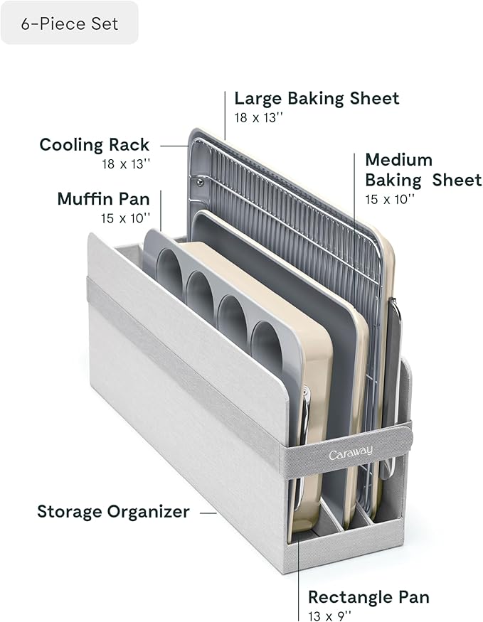 • WHAT'S IN THE BOX: Included in this 5-piece bakeware set is a 18x13" baking sheet, 10x15" baking sheet, 12 cup muffin pan, 9x13" rectangle pan, and 1 storage organizer.