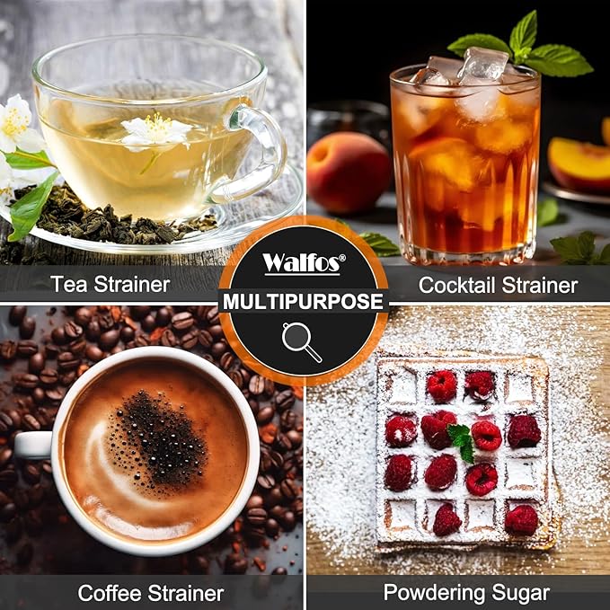 • VERSATILE SMALL STRAINER FINE MESH: WALFOS mini strainers are Ideal as tea strainers for loose tea, drink strainer for juicing, cocktail, coffee; but also great for sifting powdered sugar, spices, cocoa, flour, matcha powder, and anything that requires a small strainer. And the 2 pack can meet the needs of your different occasions