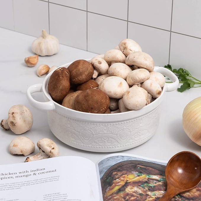 FUN ELEMENTS Casserole Dish, 2 Quart Lace Emboss Dish with Lid, Oven to Table Ceramic Round Serving Handles for Dinner and Party, Thanksgiving Christmas Gifts(Bright White)