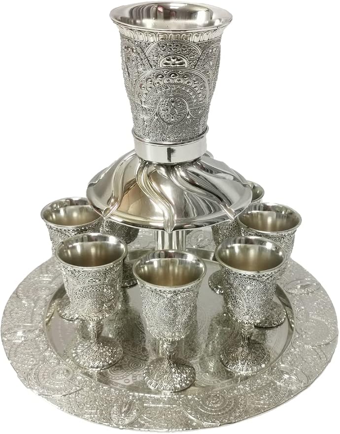 (D) Judaica Silver Plated Kiddush Fountain with Lacquer Set of 7 Pc 9.65" x 9"