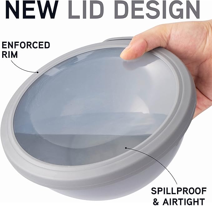 • Set includes 6 plastic bowls and 6 TPR lids; Bowl capacity of 0.32 QT, 0.74 QT, 1.37 QT, 3.69 QT and 5.8 QT.