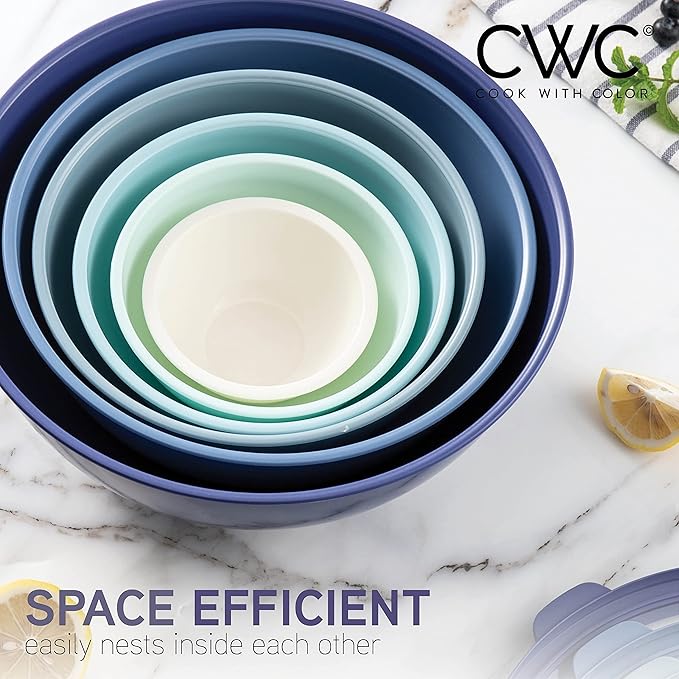 COOK WITH COLOR Mixing Bowls with TPR Lids - 12 Piece Plastic Nesting Bowls Set includes 6 Prep Bowls and 6 Lids, Microwave Safe (Blue)