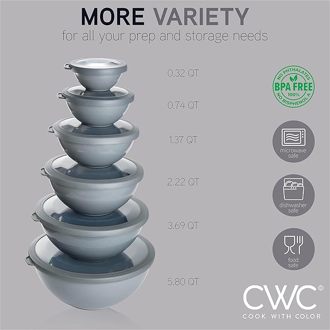 • Set includes 6 plastic bowls and 6 TPR lids; Bowl capacity of 0.32 QT, 0.74 QT, 1.37 QT, 3.69 QT and 5.8 QT.