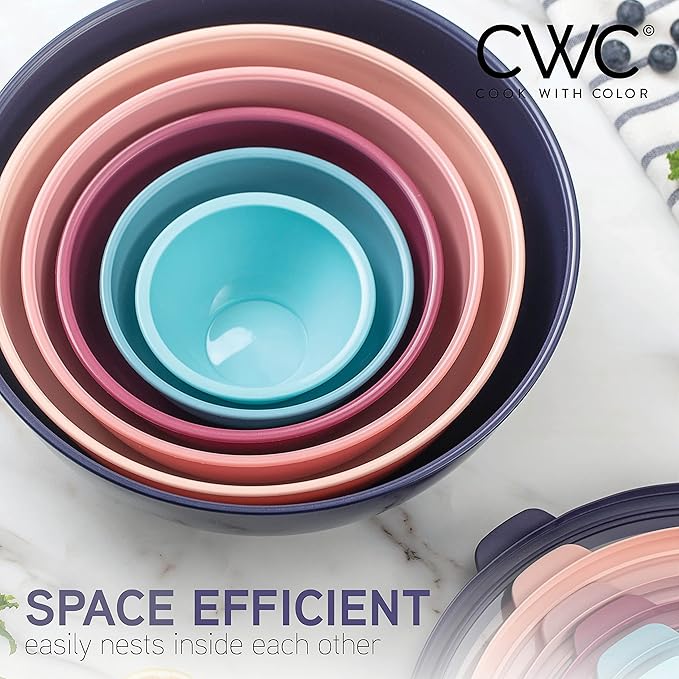 COOK WITH COLOR Mixing Bowls with TPR Lids - 12 Piece Plastic Nesting Bowls Set includes 6 Prep Bowls and 6 Lids, Microwave Safe Mixing Bowl Set (Multicolored Set with Large Blue Bowl)