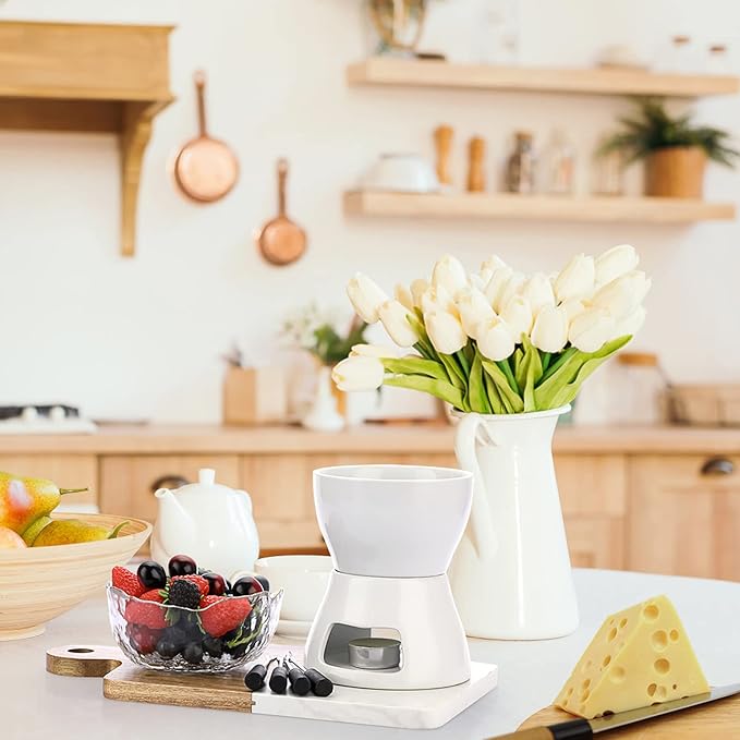 • šŸ²PACKAGE INCLUDED - This chocolate fondue pot butter warmer bowl set comes with a ceramic cup,a ceramic fondue base and 4 fondue forks. Note: Tea light candle is not included.