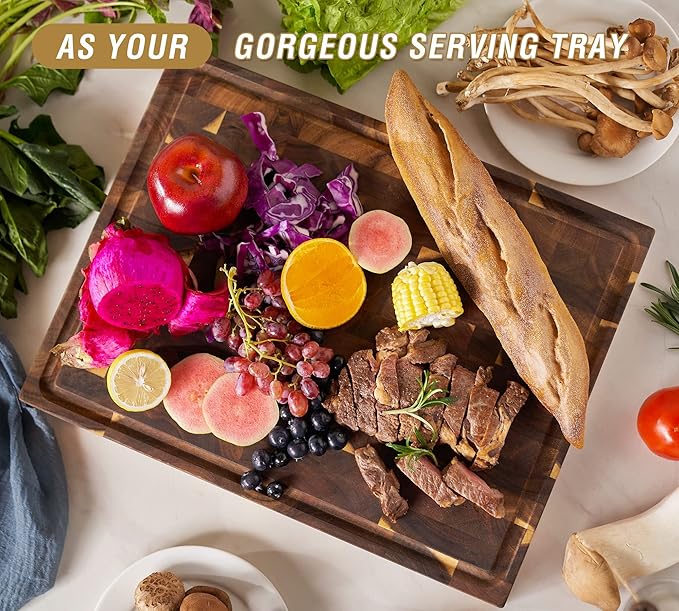 • FUNCTIONAL & VERSATILE – This reversible butcher block measure 17x13x1.5 inch, large enough to cut everything from meet, fruits to veggies, the weight keeps it from shifting, which is safer with big cutting jobs. Deep juice groove on one side to efficiently catch any liquid during food prep and serving. Super easy to lift and move with built-in handles on both ends. It can also double up as a cheese platter, charcuterie board, or serving tray
