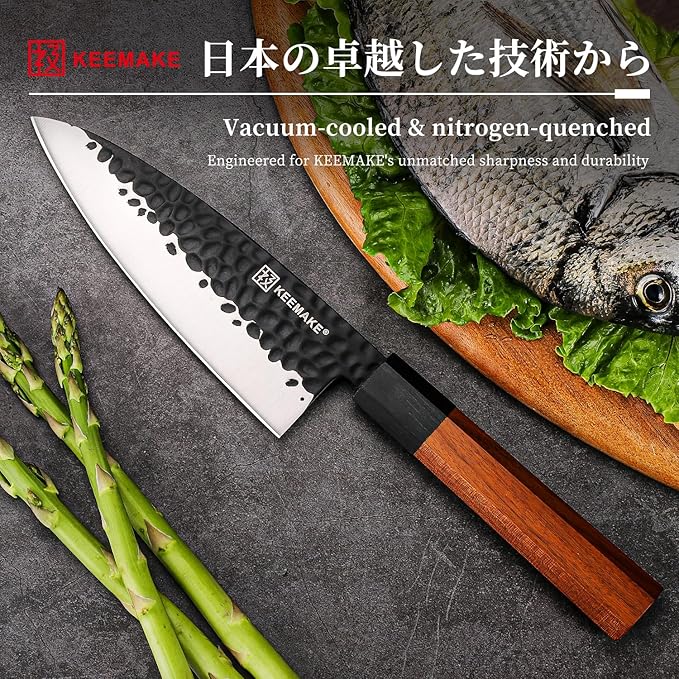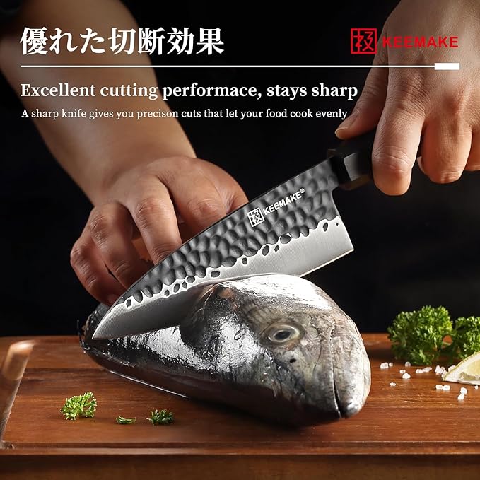 • 【CREATIVE NON STICK COATING】KEEMAKE creatively applied the non-stick black coating on the blade of this deba knife to achieve anti-rust and non-stick ability and ease to clean(it is a hydrophobic coating). The black coating gives the knife a very character