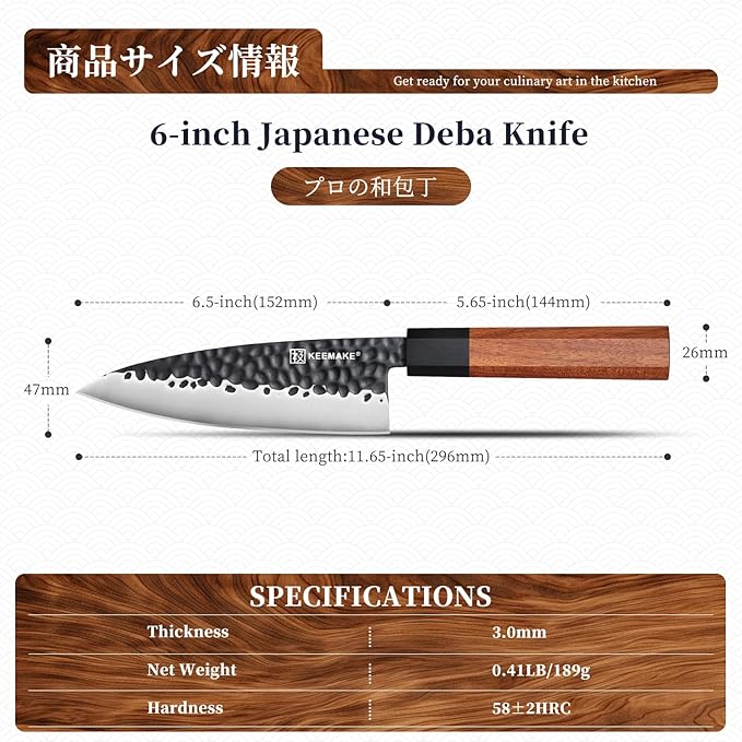 • 【PREMIUM MATERIAL】KEEMAKE KIKU series Japanese deba knife is crafted out of premium Japanese 440C high carbon stainless steel with 58+ HRC and have the effect of increasing strength (sharpness and abrasion resistance) and sticky (hard to chip). Recommend Japanese 440c steel Japanese knife because of their characteristics: ease of re-sharpening, good durability and rust resistance, and edge retention