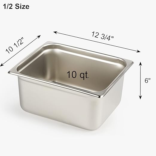 • Half Size, 6" Deep(6 Pcs) - Half-size food pans are measuring approximately 12 3/4"(325mm) x 10 1/2"(265mm).This pan is 6"(150mm) in depth and large enough to hold 10 quarts of multiple food items simultaneously. There are various sizes and depths for your choice to meet the unique requests of your daily cooking and event needs.