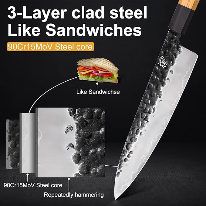 • ✔【Three-layer Composite Steel】Just like a sandwich, the deliciousness is in the middle layer. Our chef's knife, the middle steel core is 90Cr15MoV, and the Rockwell hardness reaches 59± 2 HRC. It only takes one cut to cut beef, which is smooth and easy.