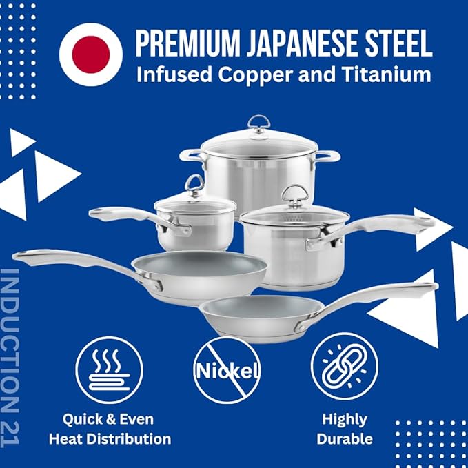 • UNIQUE JAPANESE STEEL: Made from a unique Japanese Steel, copper is melted directly into the steel, resulting in cookware that effortlessly conducts heat quickly and evenly; Titanium is also added for strength and durability to endure everyday cooking