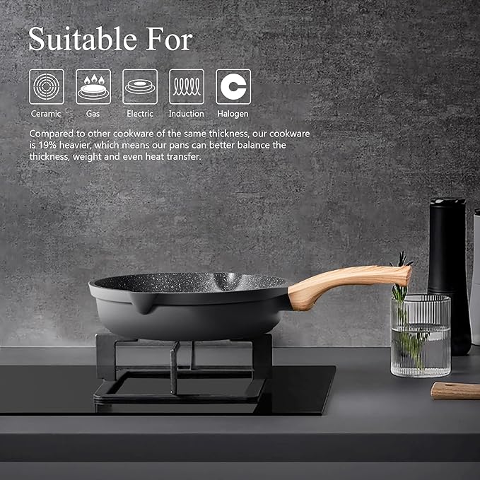 • Safety Healthy Cooking: The nonstick pan is coated with a medical stone that owns certifications from FDA, BSCI & LFGB. The natural mineral nonstick coating is very durable and at the same time 100% free of PFOA, PTFA, lead and cadmium, it is designed for healthy cooking.