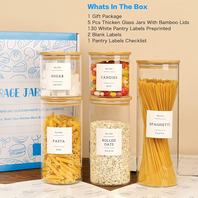 5 Pcs Glass Food Storage Containers With 132 Pantry Labels Preprinted - Thicken(3mm) Jars Airtight Bamboo Lid Stackable Kitchen Canisters Set For Candy, Cookie, Rice, Sugar, Flour