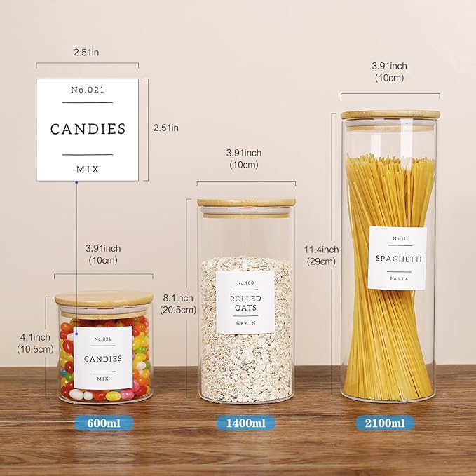 • 【PERFECT PANTRY LABELS】132 Kitchen pantry labels for glass storage containers to keep your food dry and pantry tidy. Minimalist labels are black text on white food labels stickers suitable for all airtight glass storage jars with lids for pantry. Pantry decal organization labels are preprinted on premium vinyl stickers that won't tear or peel off but can easily be removed.