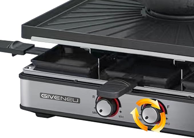 • 2-in-1 Raclette & Fondue Combo – The GIVENEU Electric Fondue Pot Set combines a 600ml brushed stainless steel fondue pot with a tabletop raclette grill plate. Perfect for up to 8 people, this versatile combo lets you melt cheese, heat chocolate, prepare broth, and grill meats, seafood, and vegetables — all at once.