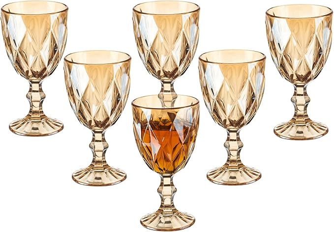Vintage Wine Glasses Set of 6, 10 Ounce Colored Glass Water Goblets, Unique Embossed Pattern High Clear Stemmed Glassware Wedding Party Bar Glass Drinking Cups Fancy Wine Glasses Amber