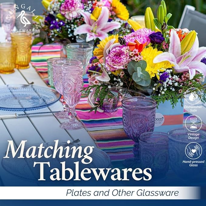 • Genuine Multi-Colored Glass: This vintage goblet collection features a stunning range of colors, including pink, clear, blue, green, smoke, and purple, all crafted from authentic colored glass that won't chip, peel, or fade. Each glass is dishwasher safe for long-lasting use