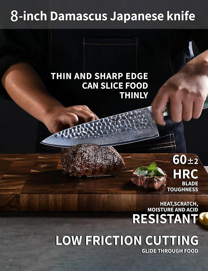 • Premium Blade: This is a chef knife type, which is made of 67 layers of Damascus steel, the core layer is VG10 material, wrapped by 33 layers of high-quality high-carbon stainless steel layers on each side to ensure excellent strength, toughness and durability. The slender blade design achieves high-precision cutting, and the forged surface is polished to minimize drag for jelly-smooth cuts and enhanced non-stick performance