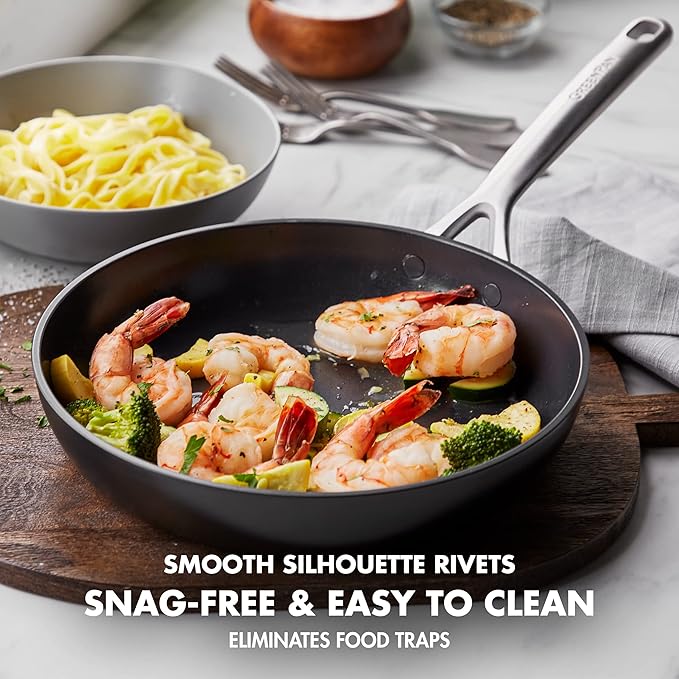 • GreenPan’s Thermolon Infinite8 healthy ceramic nonstick coating is free of PFAS, PFOA, lead, and cadmium, so it will never release toxic fumes, even if it’s accidentally overheated
