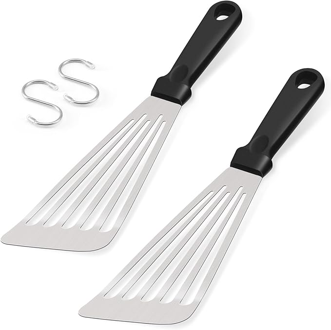 • [DISHWASHER SAFE] Both slotted turners are the same size 12.5x3.2 inches, Suitable for large pieces like sandwiches, a whole fish, filets, steaks, smash burgers, and delicate stuff like eggs and omelettes, pancakes, bacons, potatoes and veggies, Bonus extra 2 S-Hooks