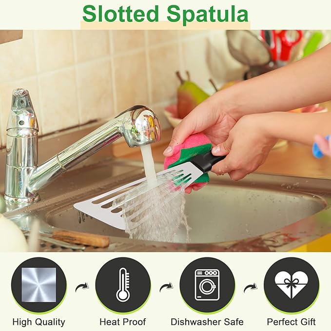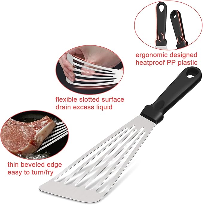 • [EXSIQUSITE DESIGN] Slender slotted surface helps to remove excess grease or liquid, Slight beveled end makes it much easier to slide under food without breaking, Flexible enough allow you to apply force to your food by pressing, Large hanging hole for convenient storage