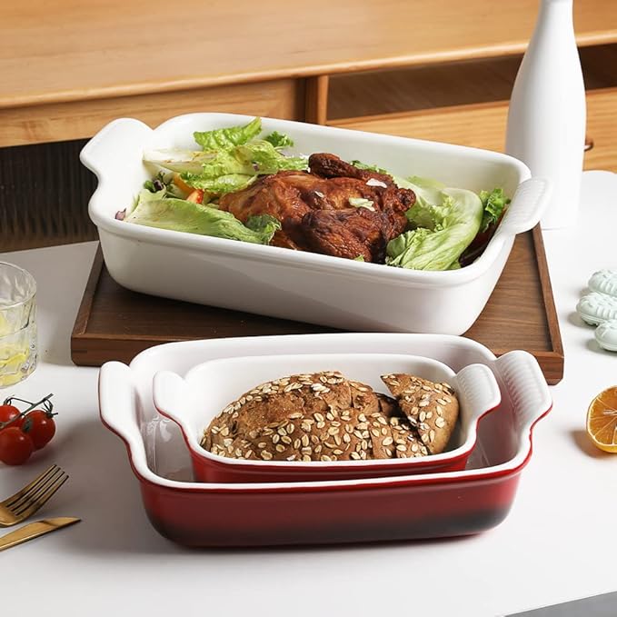• Stackable and Easy to Clean - Baking dish sets can be stacked to save more kitchen cabinet space. Smooth glaze, easy to clean, you can wash it with soap or hot water, and dishwasher safe.