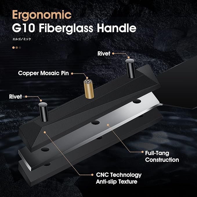 • 【A Dream to Hold】Beautifully adorned with two rivets & a copper mosaic pin, this meat knife’s ergonomic G10 fiberglass handle will feel as if it were made just for you. Unique geometry features line design allows your hand to fit closely with the handle, and not get tired of holding it for a long time. Full tang structure will not easily break even if you wield the knife at will, maximizing the service life.