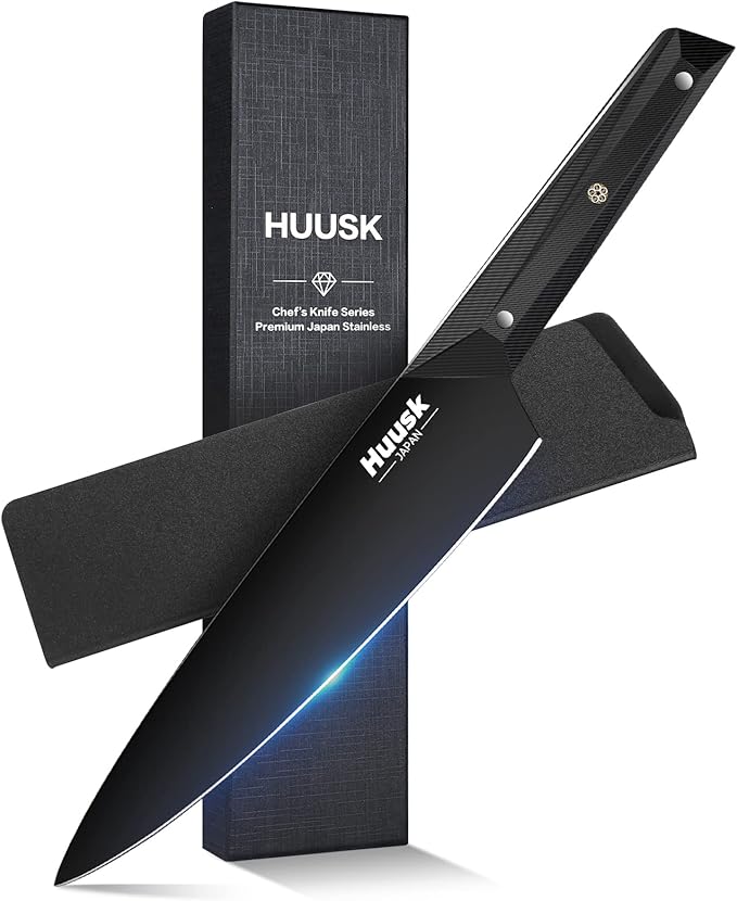 Huusk Japan Knife, AUS 8 Stainless Steel Japanese Chef Knife 8" Black Titanium Coated Blade Ergonomic G10 Handle with Sheath, Cool Gyuto Knife