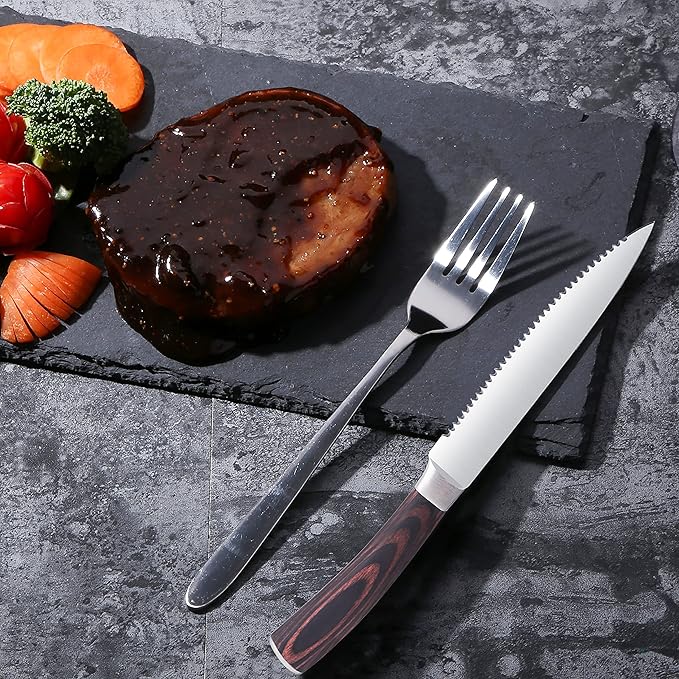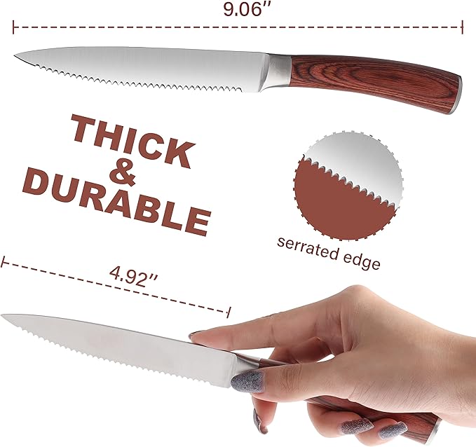 • ★High-End Craftsmanship: Exquisitely designed with premium materials & super-precision-crafted. LUVCOSY Steak Knife Set sports exotic Pakkawood handles, sanded with a smooth finish for a polished look.
