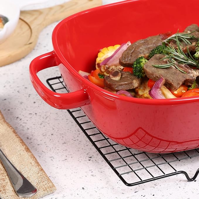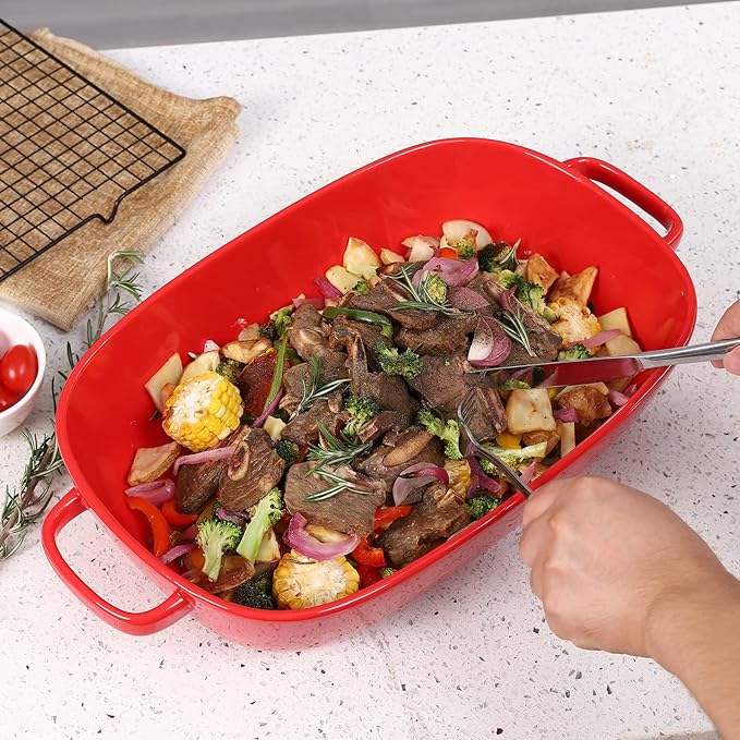 • Oversized Rectangular Lasagna Pan: Size for 16x11x3.5 inches, 6-Quart Capacity.We have 3 colors large rectangular baking dishes for choose from, Red, Blue, White.For sweet or savory baking, from cookies to baking pan dinners.Very suitable for housewarming, banquets, Thanksgiving, Mother's Day, Father's Day, parties, Christmas and New Year gifts to your friends and family.A perfect gift for everyone.