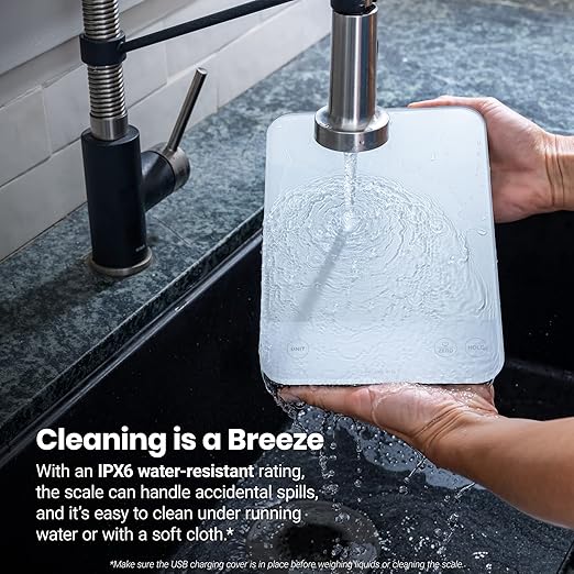 • ๐—ช๐—ฎ๐˜๐—ฒ๐—ฟ-๐—ฅ๐—ฒ๐˜€๐—ถ๐˜€๐˜๐—ฎ๐—ป๐˜ ๐——๐—ฒ๐˜€๐—ถ๐—ด๐—ป: The scale features an IPX6 water-resistant design, allowing you to easily measure liquids and wipe the scale clean