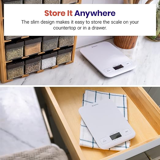 • Easy to Store: With dimensions of 7.2 x 5.7 x 0.7 inches, you can easily store the scale on your countertop or in a drawer
