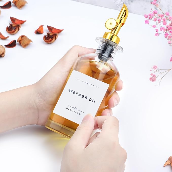 • Thoughtful Design - The olive oil dispenser brass color weighted is automatically opened when pouring down and closed when pouring up vertically without manual closing. Free up your hands while you're busy cooking. Each set of oil bottles comes with 20 high-quality waterproof labels that can be reused many times and do not leave any residue when removed.