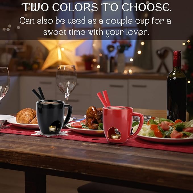 • 🍲PREMIUM STURDY MATERIAL - This chocolate fondue mug set is made of high-quality, sturdy, high-temperature resistant ceramic, which heats evenly. Two colors to choose.Can also be used as a couple cup for a sweet time with your lover.
