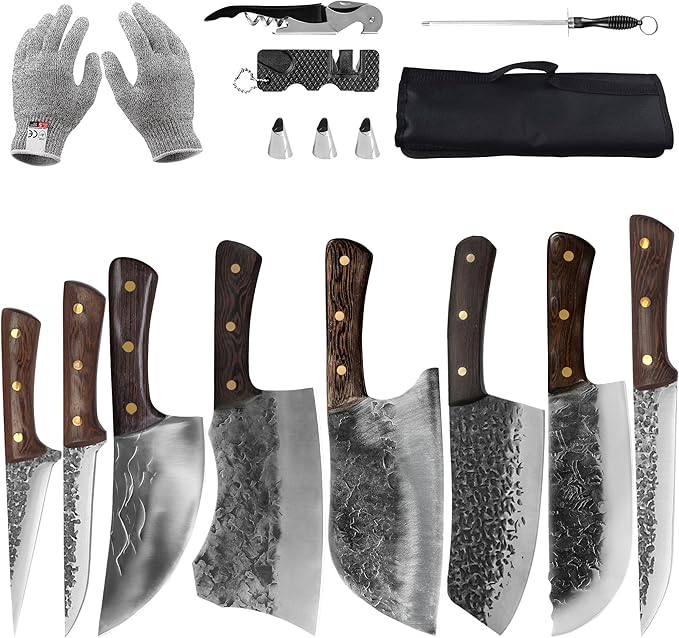 FULLHI 14pcs Butcher Knife Set Hand Forged chef knife Boning Knife With Sheath High Carbon Steel Chef For Kitchen, Camping, BBQ