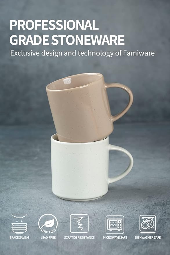 • 【HIGH QUALITY】Famiware coffee cups uses high-quality stoneware, food-grade safe materials, is a healthy choice for family use. Compared with plastic and glass, stoneware cups are moderate in weight, healthy in material, and long-lasting, bringing you and your family a healthier life.