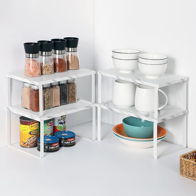 NEX Kitchen Counter Shelf, Stackable Cabinet Shelf Organizers Expandable Countertop Shelf for Pantry, Set of 4, White