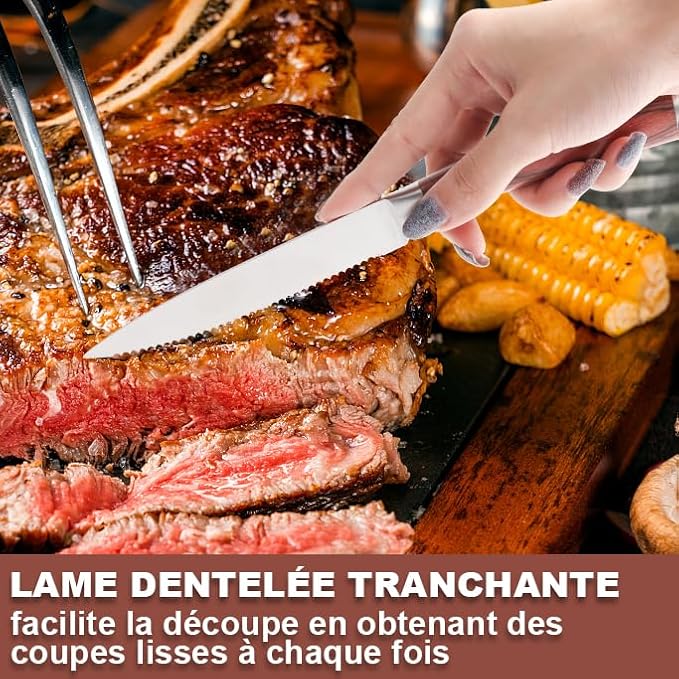 • ★Fine Serrated Blade: Extremely Sharp Serrated Blades for a Smooth Clean Cut. The blades are hand sharpened, work well for cutting meat, especially for beef and steak, and is great for dinners, parties, picnics, and weddings.